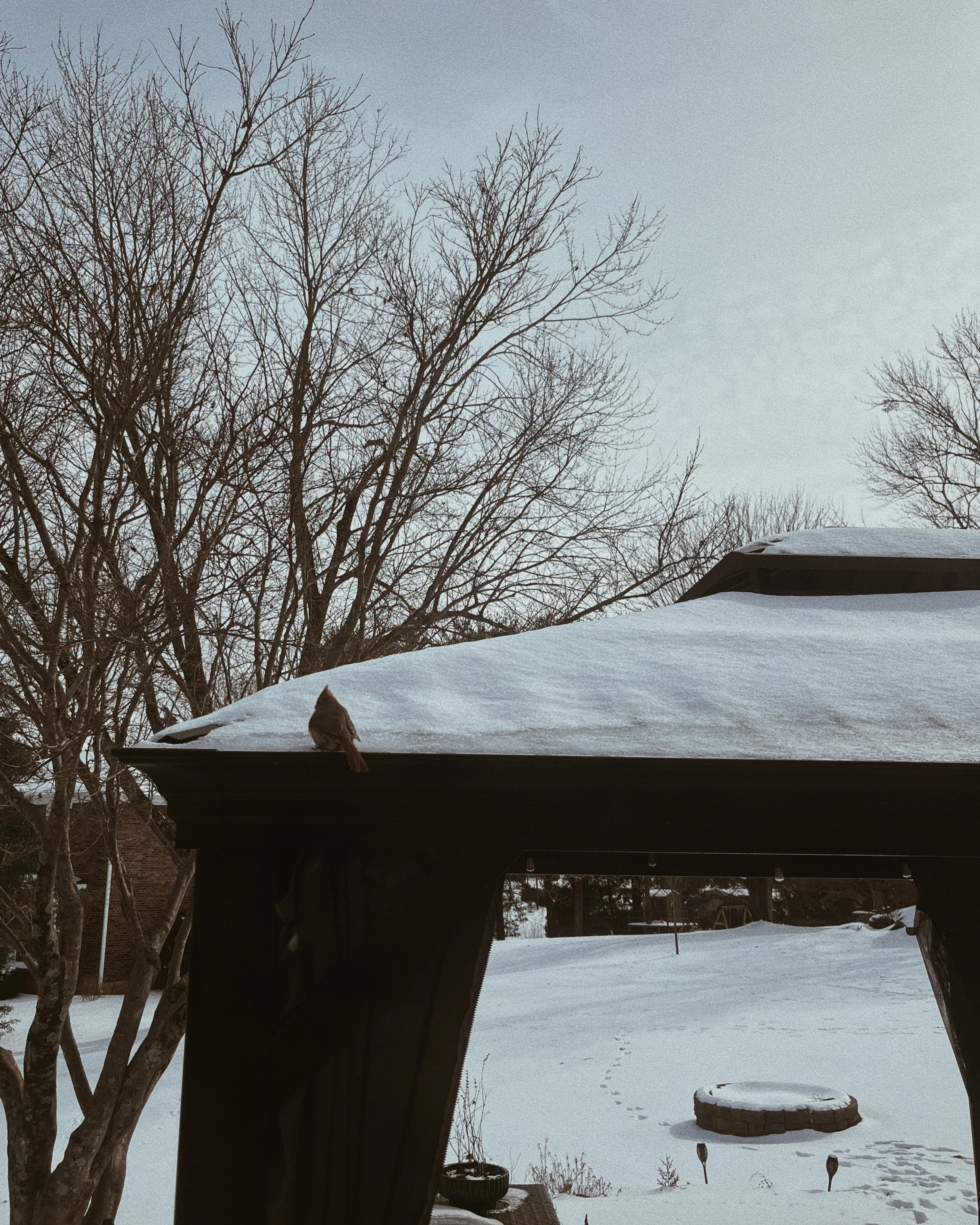 A cardinal (female) perched right outside my window one snowy morning– “not rushing it”